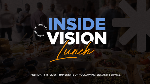 The Inside Vision Lunch is where you will find out who we are, what we do, and how you can get involved. Meet our staff — learn more about the history, mission, and vision of Vision. Learn more about serving opportunities, how to become a member, and meet ministry team leaders. Learn more about our LifeGroups and meet some of our LifeGroup leaders. We will meet following the second service and serve lunch!