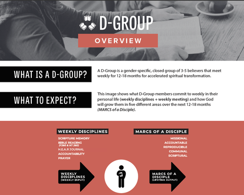 A D-Group is a gender specific, closed group of 3-5 believers who meet together weekly for the purpose of accelerated spiritual transformation. A person joins the D-Group by invitation only, with most D-Groups being formed out of relationships in a Life Group.